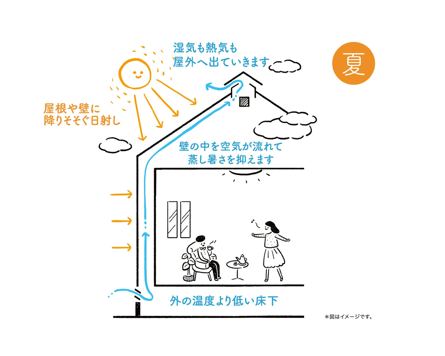 通気口から入った空気は、床下のひんやりした空気と混ざって壁の中を上昇します。自然な空気の流れが、焼け込みの熱を緩和し、無駄な湿気を一掃する仕組みです。壁の中を空気が流れること、室内は熱気の影響を受けにくい快適な空間になります。
