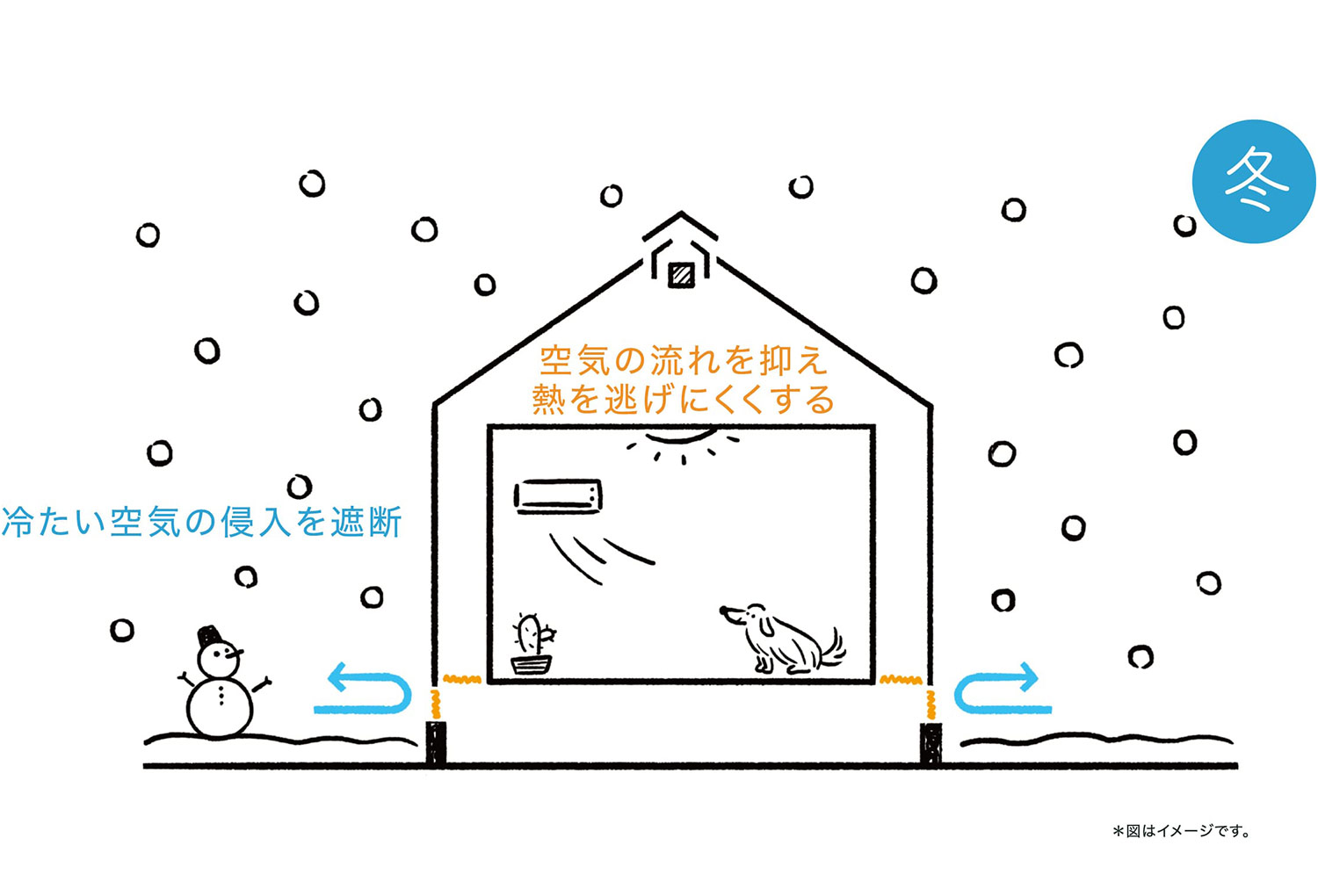 気温が低下すると各通気口は自動的に閉じて、冷たい空気の侵入を防ぎます。壁の中の空気を動きにくくすることで、室内暖房の熱が逃げにくくなり断熱性がアップします。夏の通気性とは一変、家は気密性が高い状態になります。
