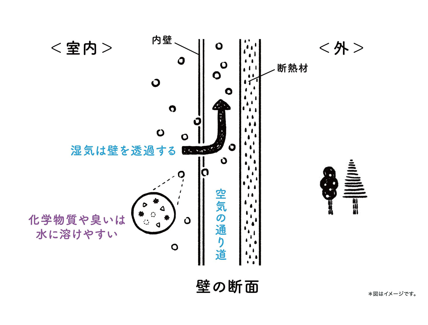 室内の有害な化学物質や生活臭は、湿気とともに透湿性の壁を透過して、屋外へ排出されます。機械による室内換気をしなくても、室内ホルムアルデヒド濃度を低く抑えることができます(厚生労働省指標値0.08ppm)。余分な湿気も抑えるので結露する心配もありません。室内は常にクリーンな空気で保たれます。