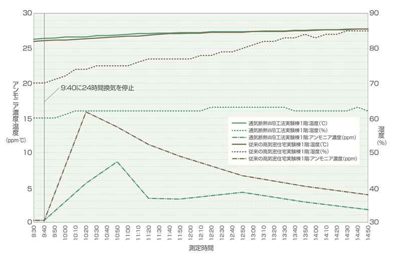 同じ規模の住宅2棟を密閉状態にし、アンモニア水溶液(28%)5mlを付けた濾紙をシャーレに入れて部屋の中央床上18cmに設置。出入り口左側上1.5mの位置にてアンモニアを測定しました。アンモニア水溶液設置後30分間隔で測定。室内の温湿度測定は、室内空間の中央部で10分間隔で測定しました。各部屋には人体発湿装置(発湿量50cc/h運転)を設置しています。実験は24時間換気を回した状態で開始し、9:40の時点で24時間換気を停止しました。※特定悪臭物質の測定方法準拠(昭和47年環境庁告示第9号)