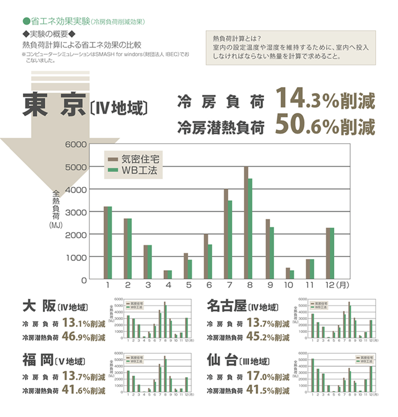 断熱性能が同じ2棟の建物を使用して、エアコンの省エネ効果を実験しました。 透湿性クロスを使用したWB工法と、ビニールクロス使用した一般住宅、それぞれで大人一人が生活していると仮定し、その際にエアコンを使用した場合の効率を計測。仙台、東京、名古屋、大阪、福岡の気候条件を設定し、それぞれの測定を行いました。