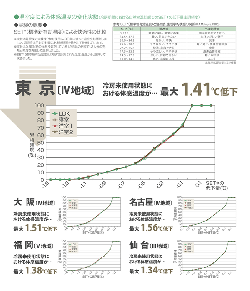 また、WB工法では冷房を使用しない状態における室内の体感温度が低いことがわかりました。 夏も快適に過ごすことができる工法なのです。